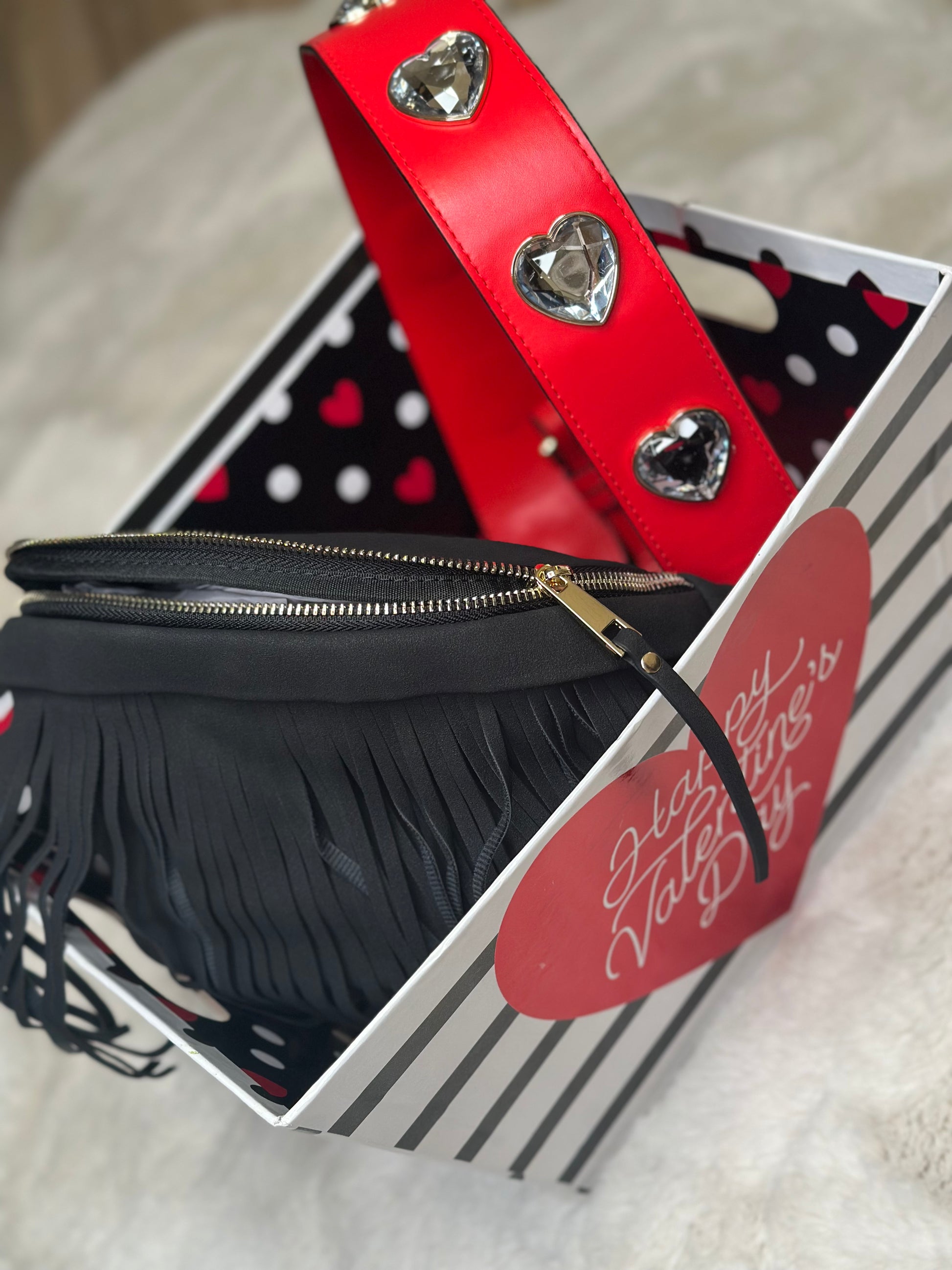 Enjoy the luxury and practicality of going hands-free with this bag made of high-quality, soft suede. Designed to be cute and comfortable, it has an interior pocket to keep your things organized, includes an adjustable hip to crossbody strap, and has a removeable fringe so you can switch your style for any occasion. Strap adjusts 24-48 inches for versatility of a fanny pack or sling bag. Black with gold hardware. Approximate size: 10.5 x 5.5 inches.