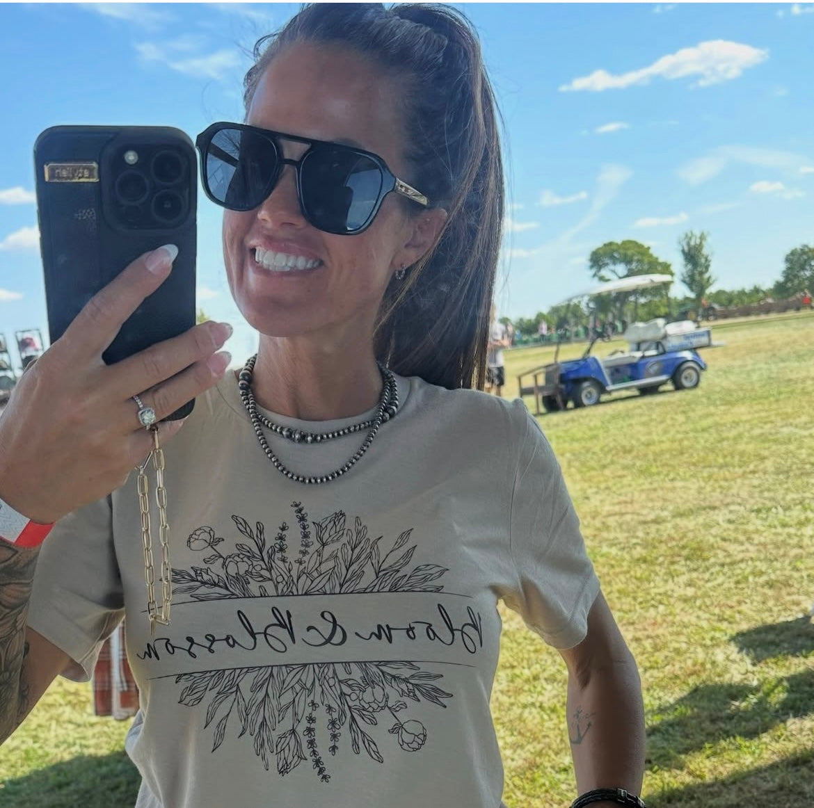 Graphic tee with black Bloom & Blossom logo. Unisex fit. 52% cotton and 48% polyester.