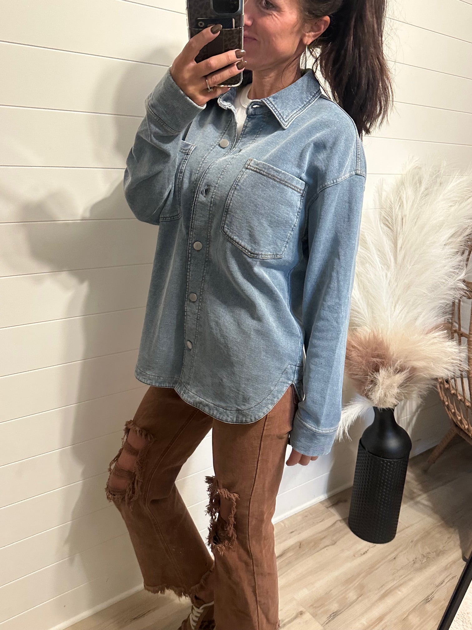 Knit shacket with button closure and chest pockets. 100% cotton.