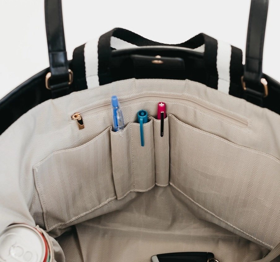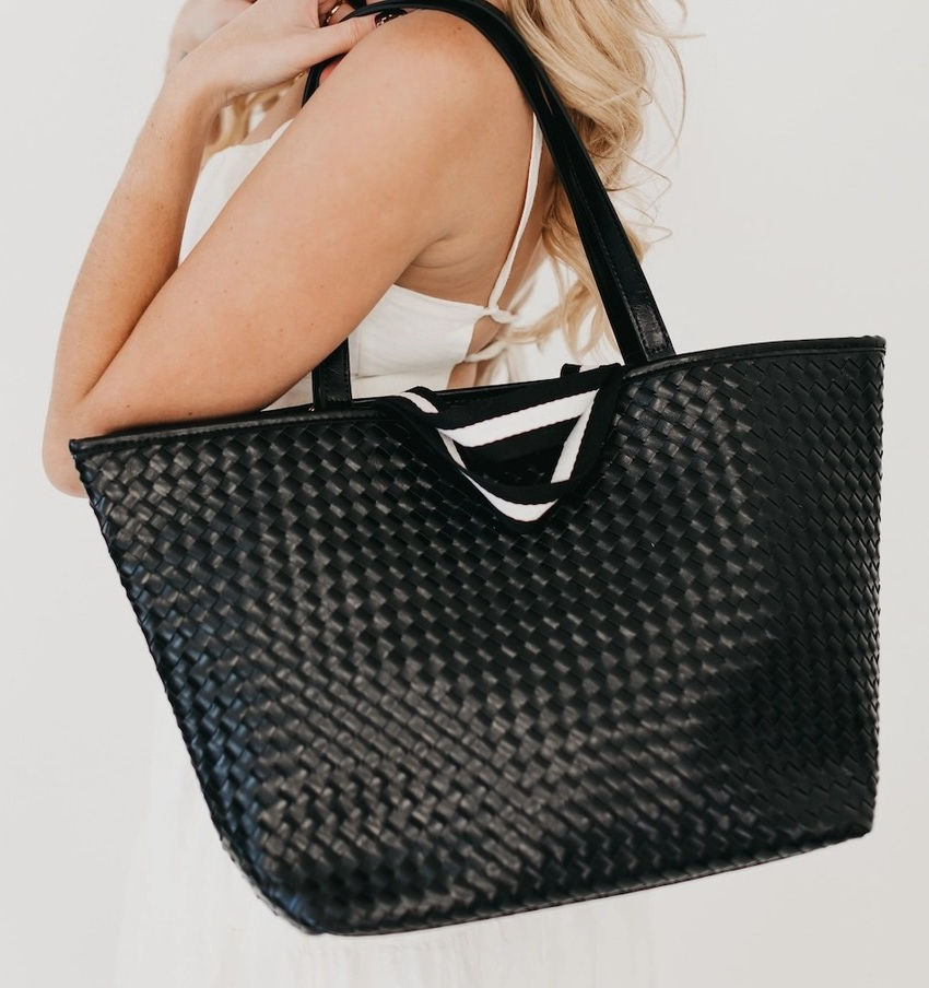 This must have bag is made from high quality woven vegan leather and includes a vegan leather shoulder strap, a canvas striped hand strap, and a snap closure. Inside the bag, you will find a variety of organizational features including 2 side water bottle pockets, a zipper pocket, many pockets, a key leash, and a secured laptop sleeve. This bag will be your new everyday go-to! Approximately 21"L x 7"W x 11.5"H.
