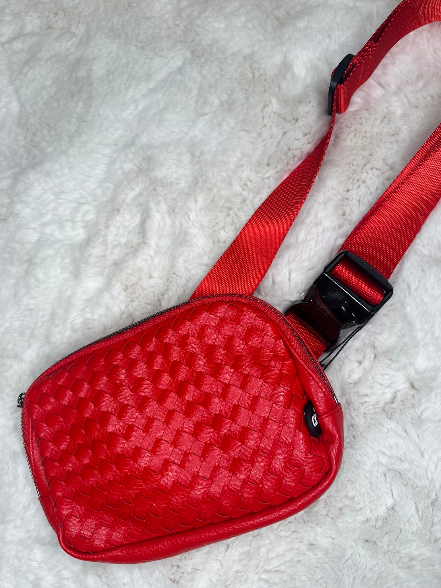 This red belt bag takes you from athleisure to elegant with its woven faux leather design.