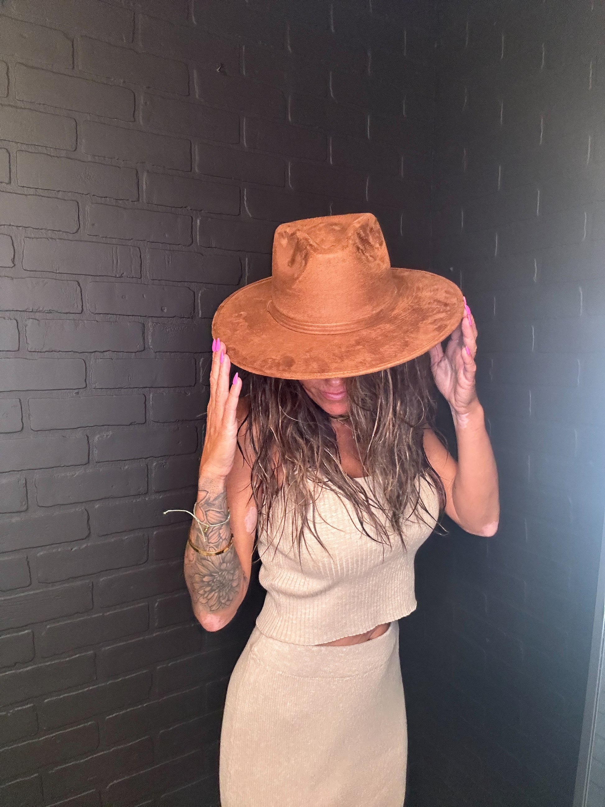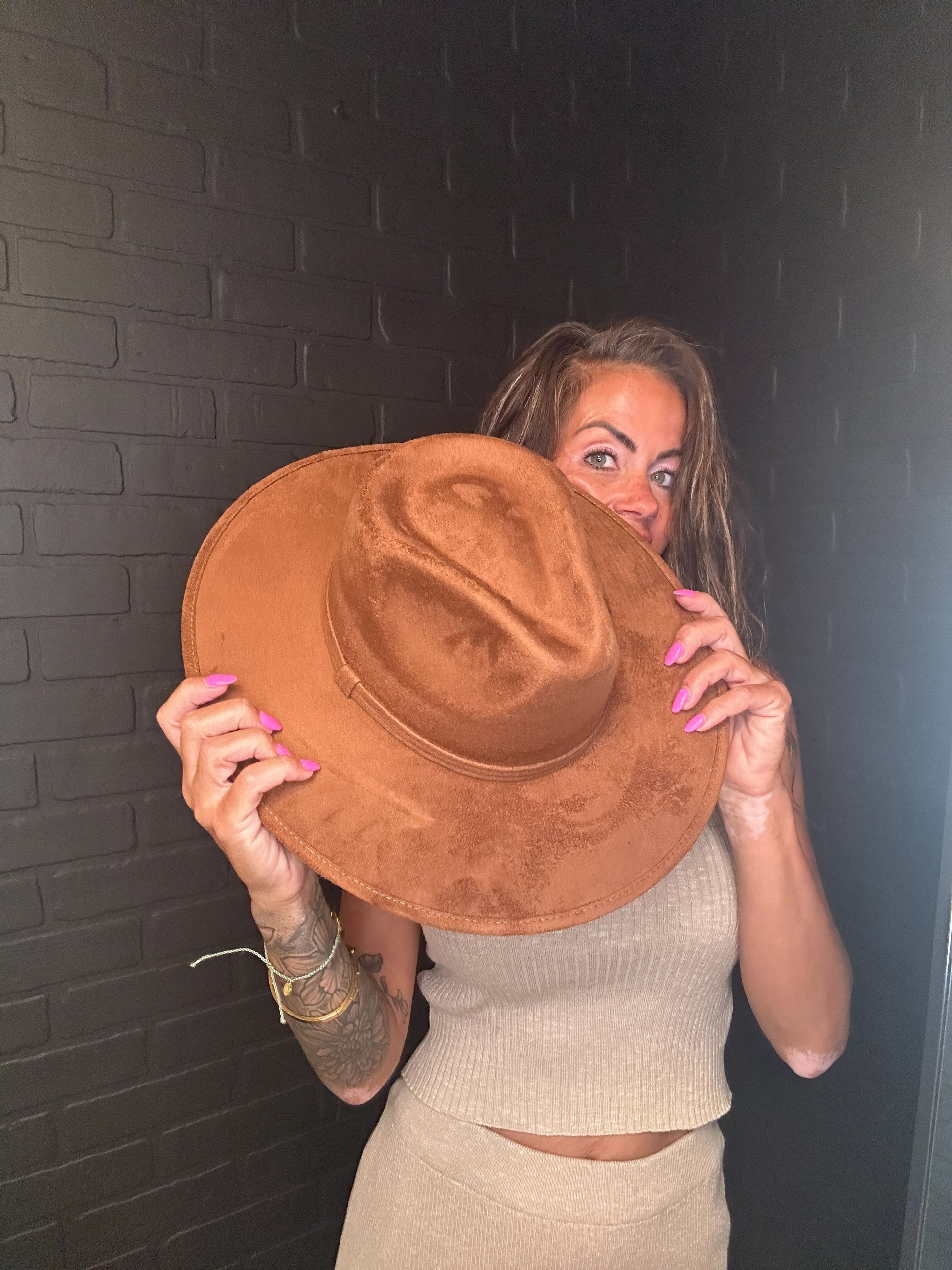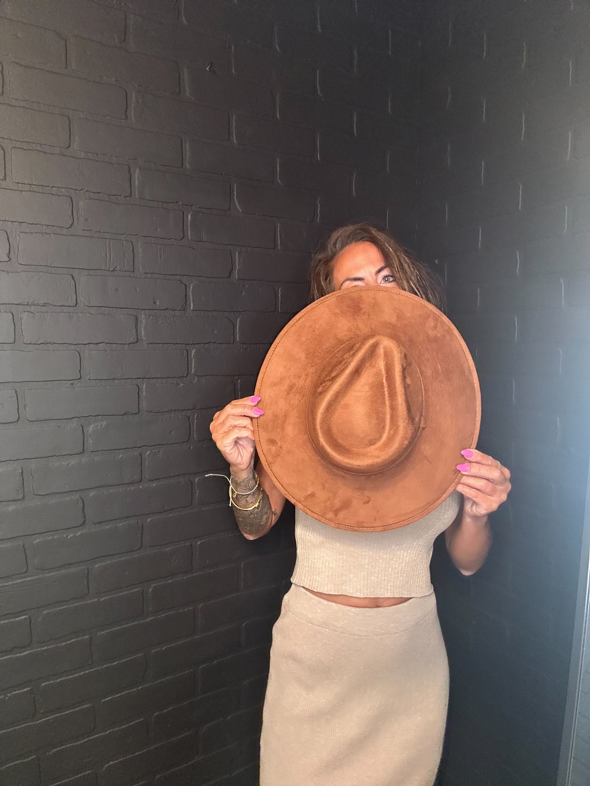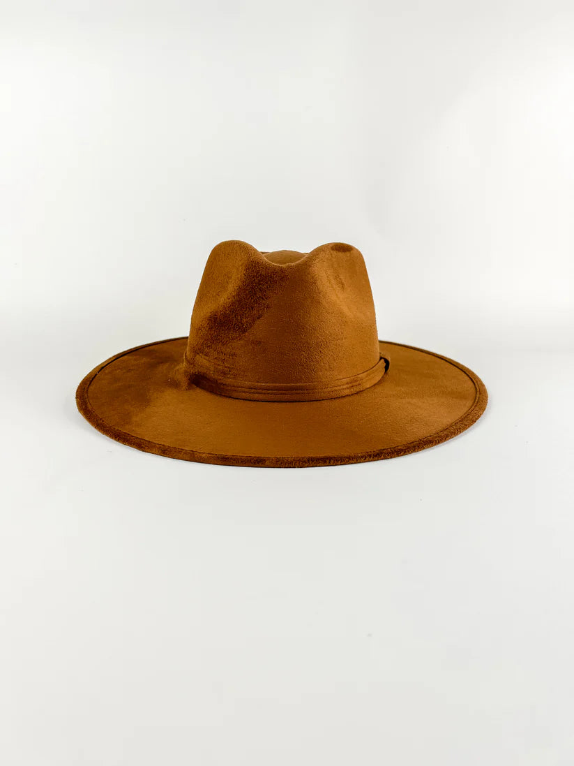 This caramel vegan suede rancher hat has a 3" durable stiff brim. Elastic inner band so one size fits all.