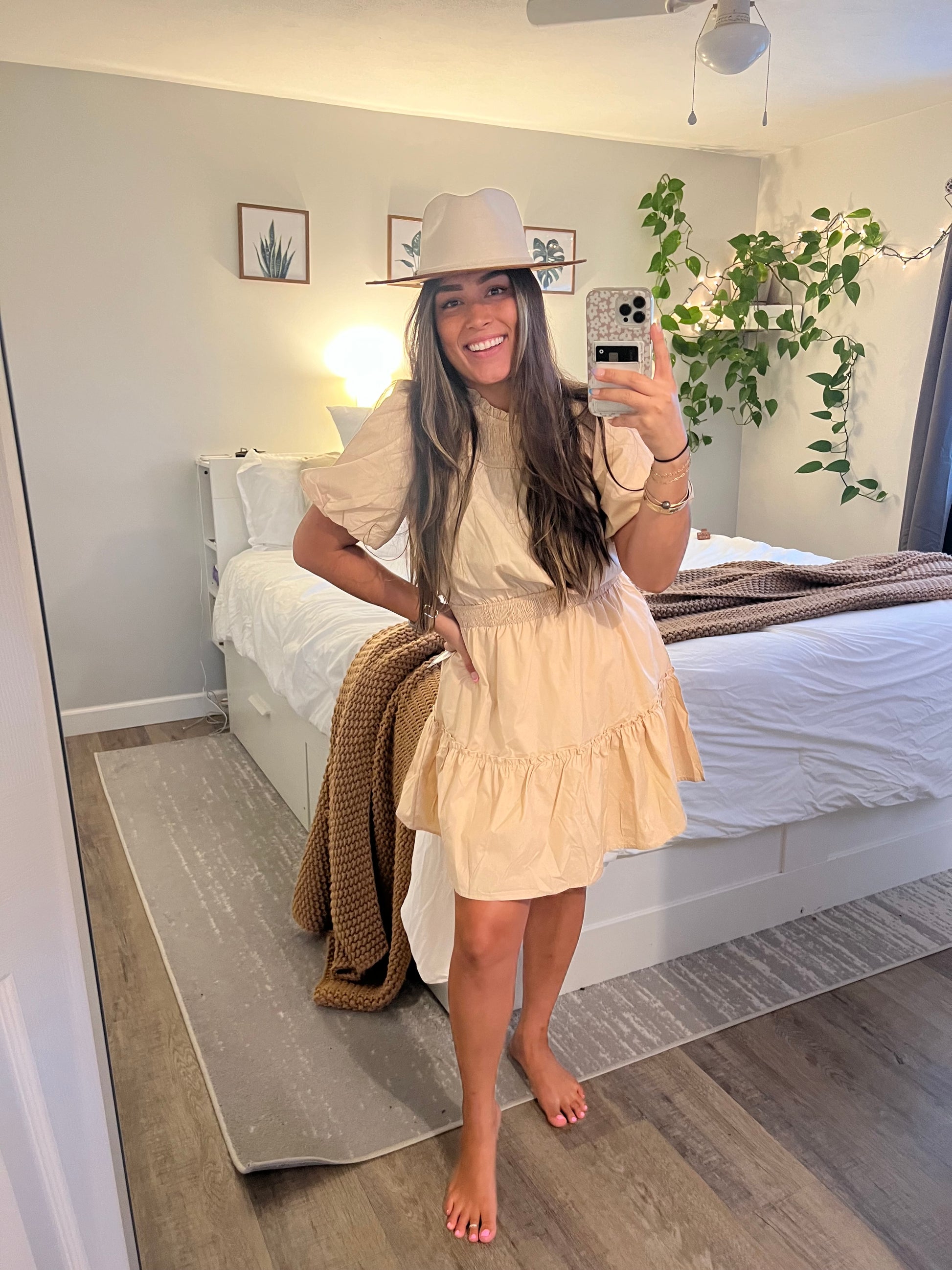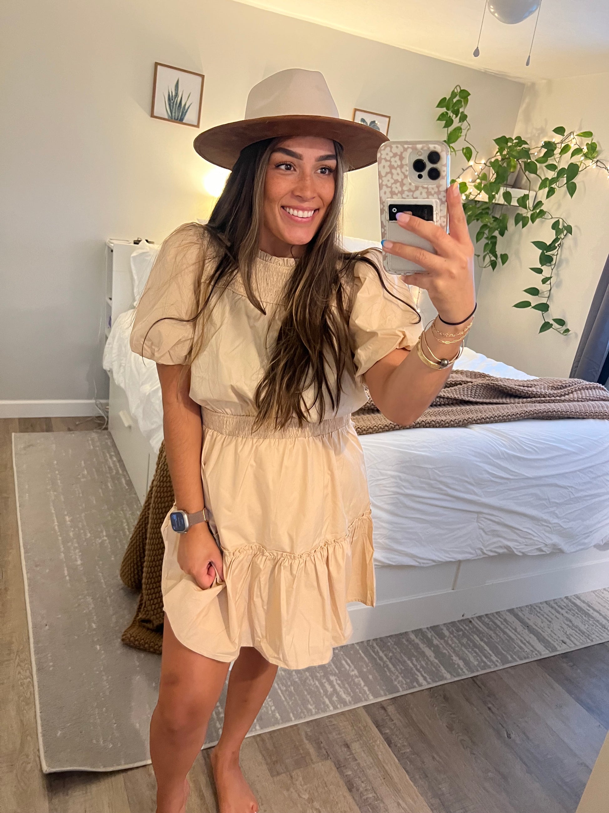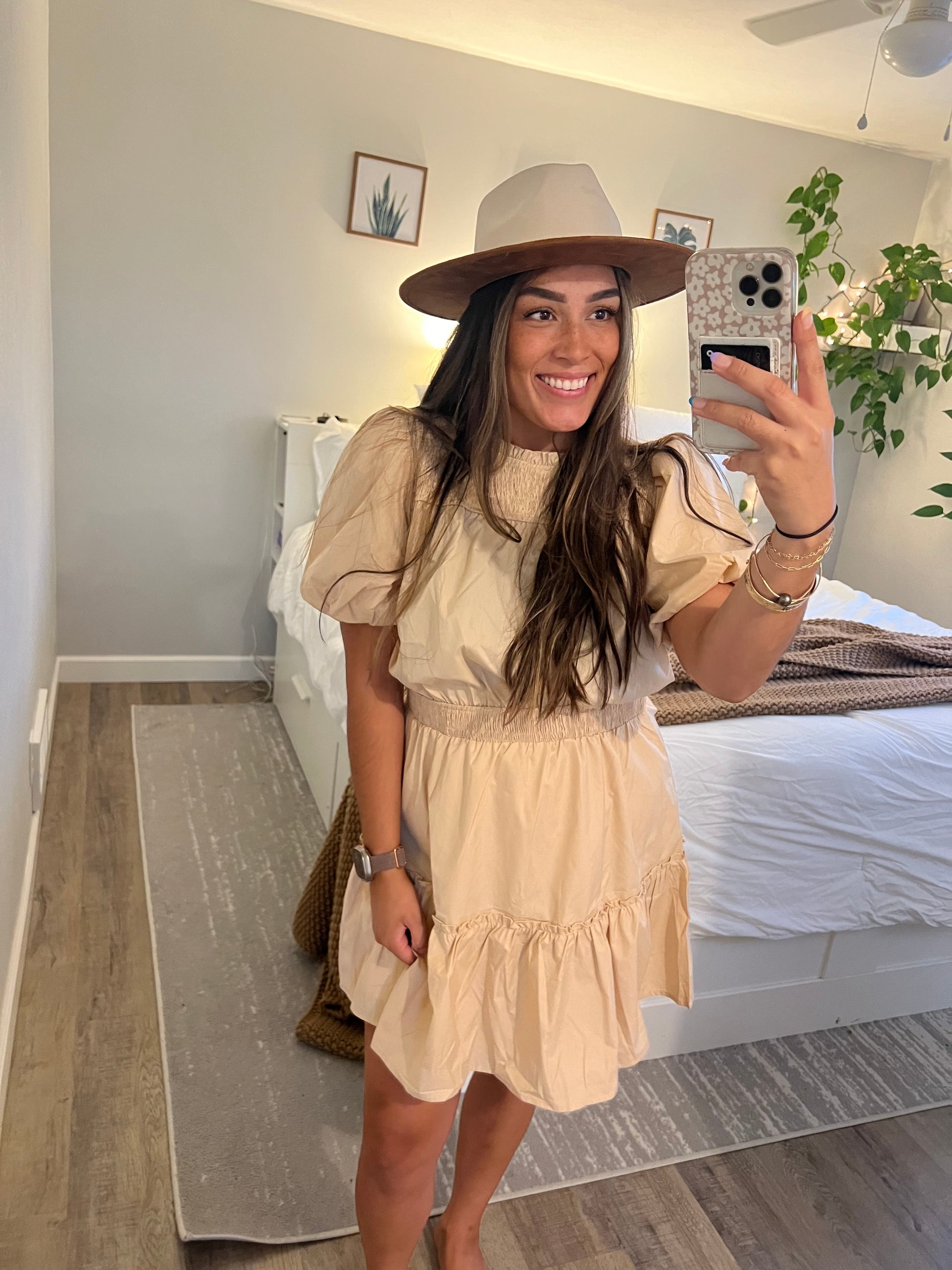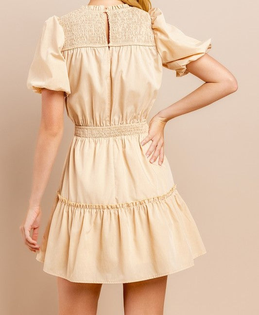 Puff sleeve dress with smocked top and waist. Features a ruffle skirt and back buttoned keyhole. 80% polyester and 20% cotton.