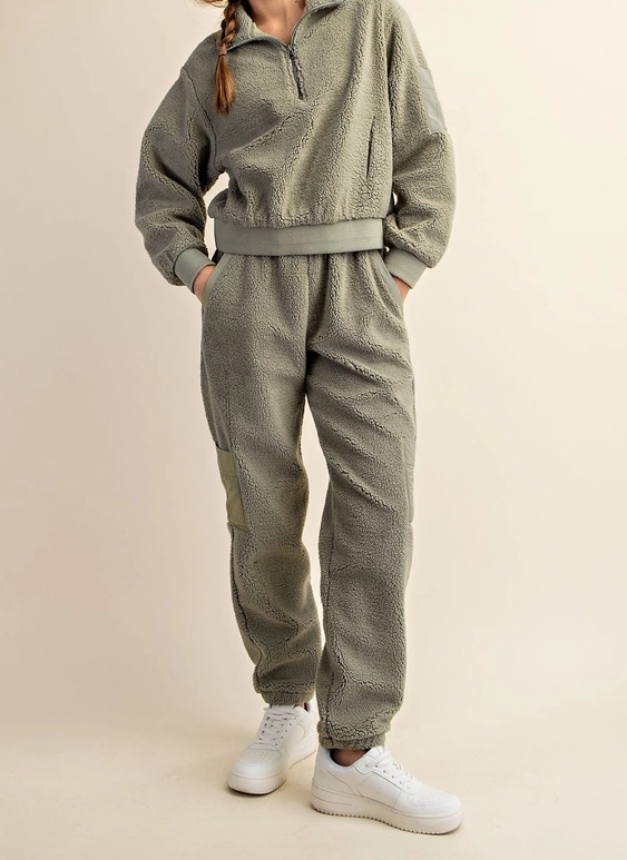 Elevate your winter wardrobe with this micro sherpa set where luxurious comfort meets contemporary design. The half zip top, with an added single pocket on the left arm, features a mock neck that exudes a touch of sophistication while the ribbed details at the cuffs and bottom band provide a sleek finish delivering unparalleled softness and comfort. The sweatpants provide ample storage without compromising on comfort. The cargo design features an elastic waistband, two open cargo pockets, and side hand pockets. This set seamlessly blends functionality with fashion. Relaxed fit. 100% polyester.