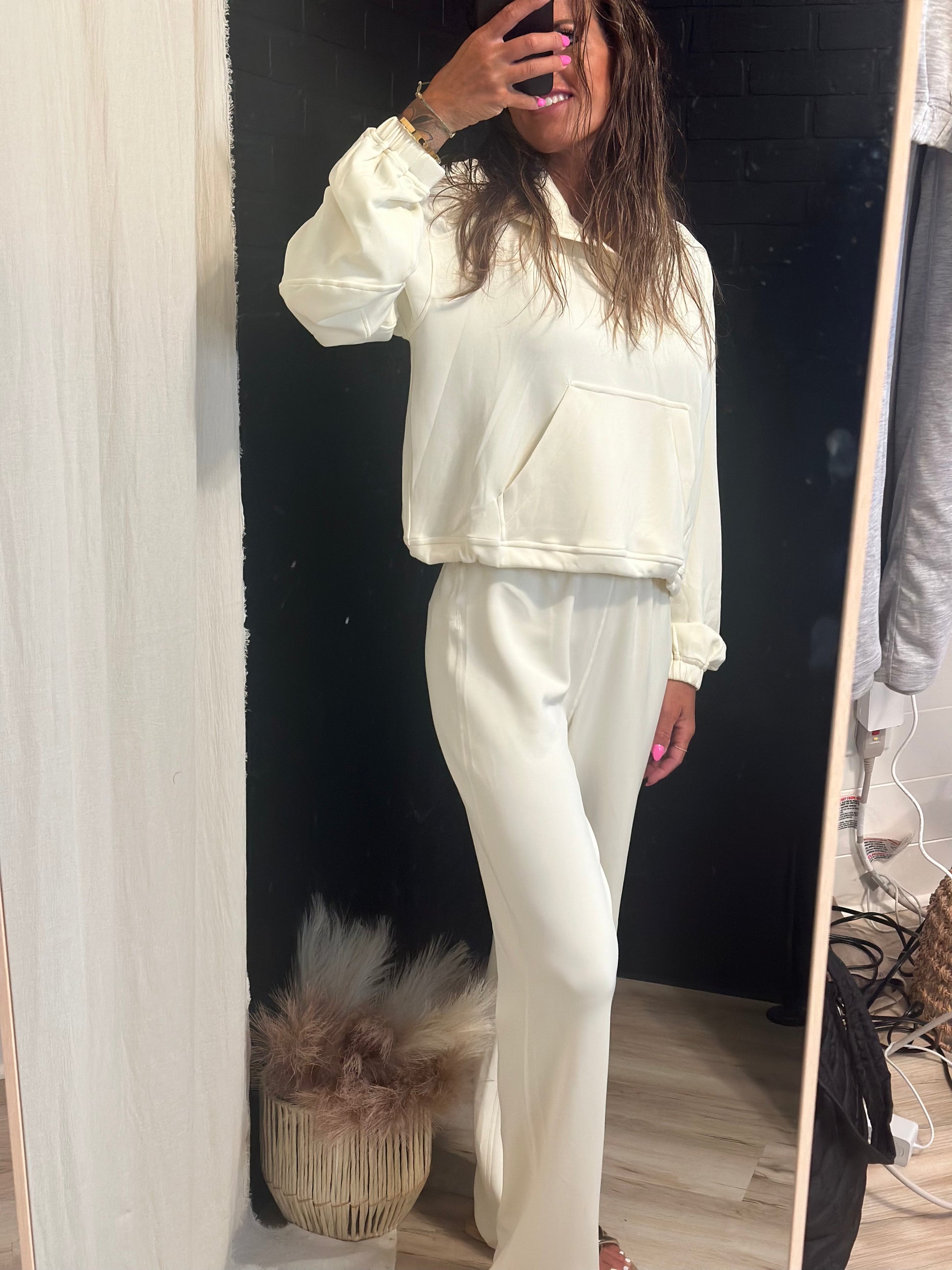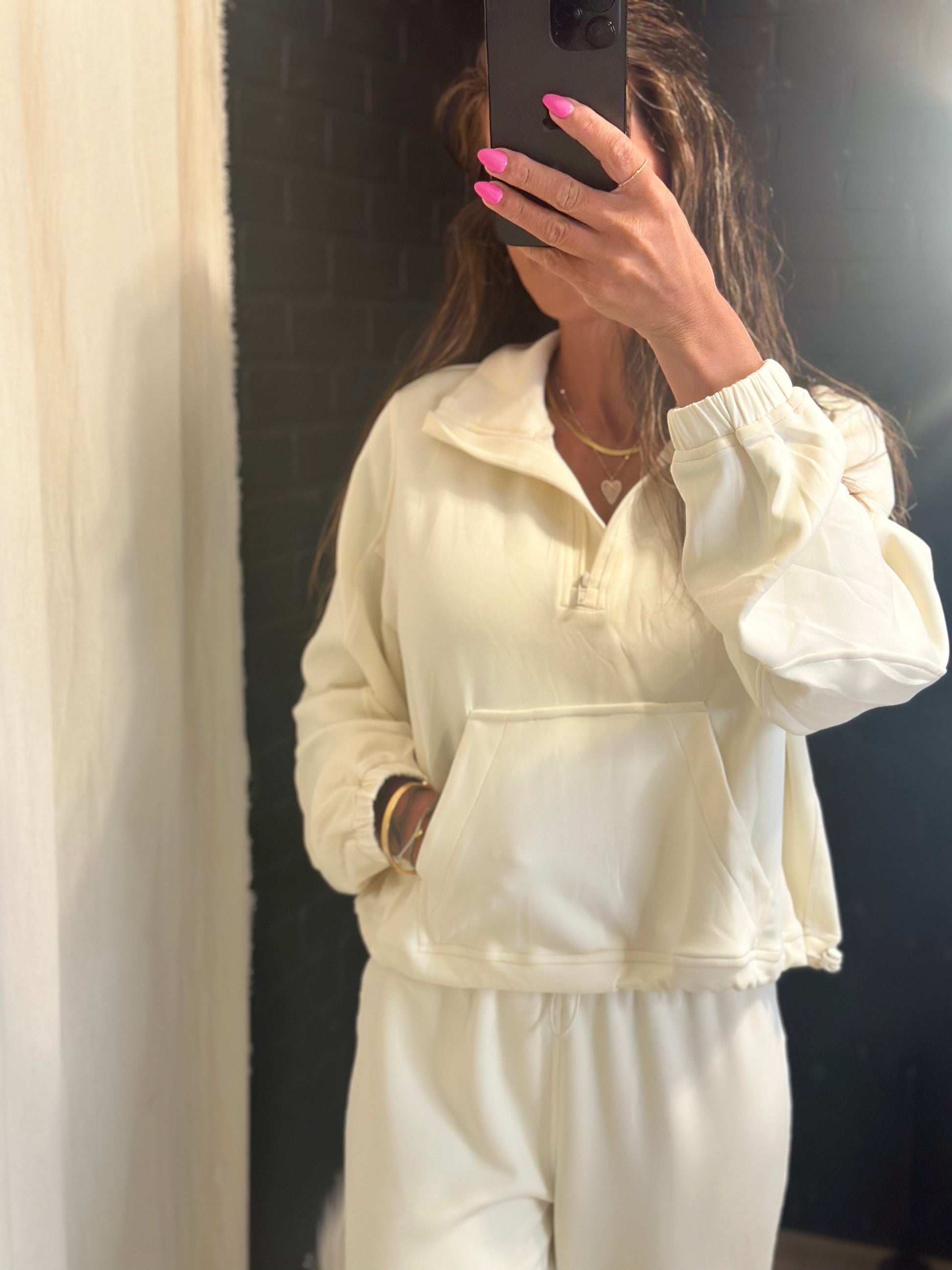 Quarter zip sweatshirt featuring a mock neck and kangaroo pocket paired with high waisted full-length stretch pants featuring an elastic waistband and adjustable drawstring. Lightweight, soft, and stretchy. 51% polyester, 43% modal, and 6% spandex.
